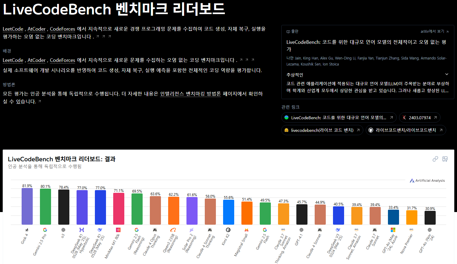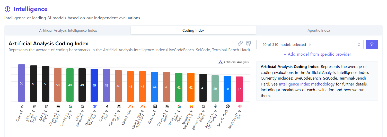확실한 카테고리 킬러가 없는 상황에서 AI자체의 업그레이드 보다는 그걸 보조해주는 툴들이 많아지는 시기 인 듯 하다. 그래도 GPT5-CODEX과 소넷 4.5의 등장으로 순위 변동이 저번보다 심하다는 것. AI 버전이 바뀐 모델 외에는 특별히 자주 사용하는 주류 AI에는 성능 변화가 거의 없었다. 첫번째로 지능 부분이다. (지능 인덱스 방법론) 등장하자 1등 먹은 GPT-5 CODEX, High, Medium 시리즈 버전의 지능이 앞서있고 그와 비슷하게 Grok 4, 놀랍게도 이번에 등장한 모델인 Sonnet 4.5가 바짝 쫓고 있다. 그 뒤를 Gemini 2.5 Pro, Opus 4.1등 지능은 큰 순위 변화가 없었다. 다음은 코딩 차례다. 저번달 과 같은 순이긴 하지만 Grok 4가 아슬아슬..